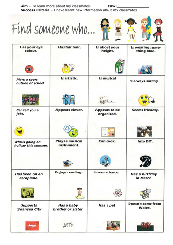 Find someone who… you may need to model some question structures on the board before students start mingling.